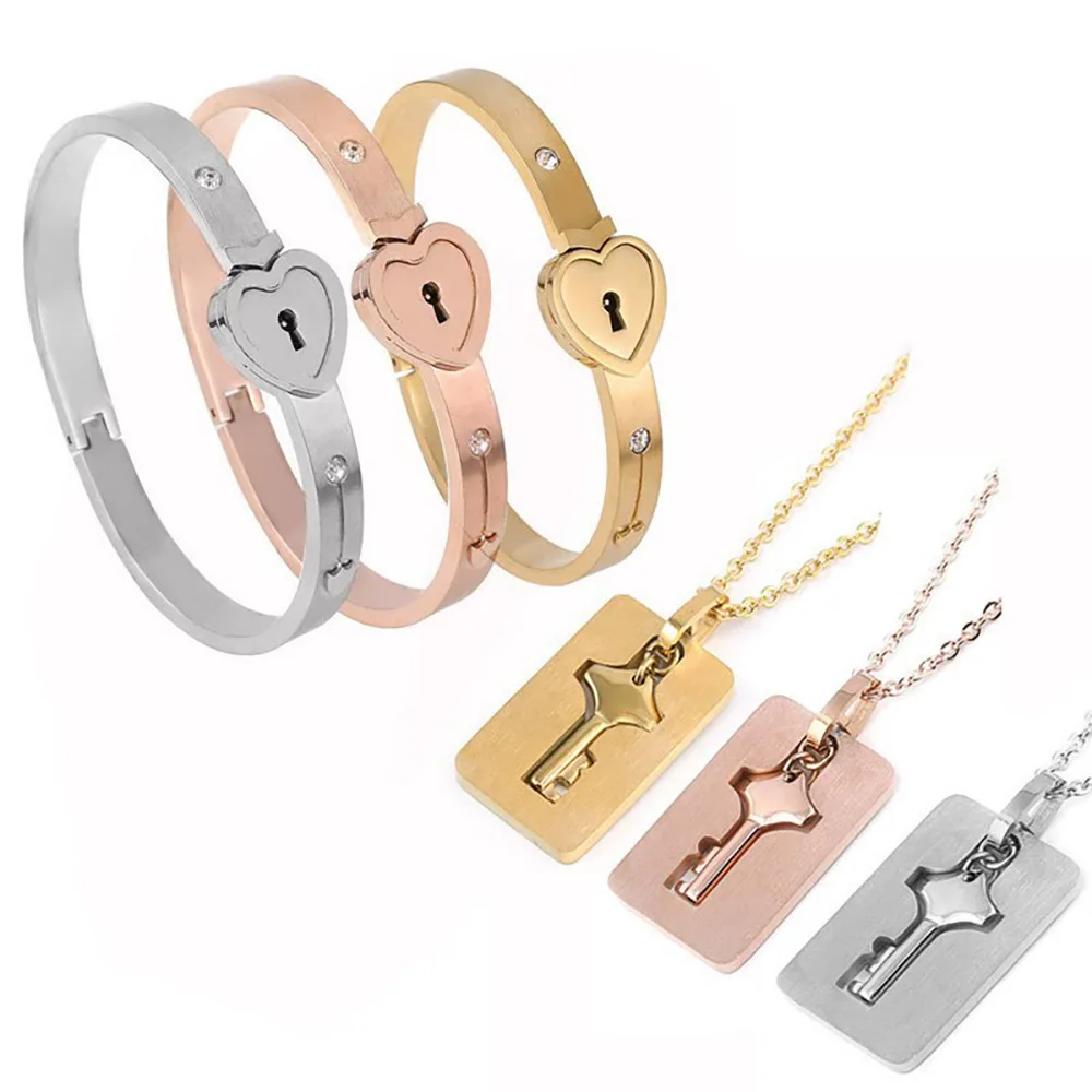 Best verkochte roestvrijstalen "Skyward" hartvormige slot- en sleutelpaararmband-kettingset
